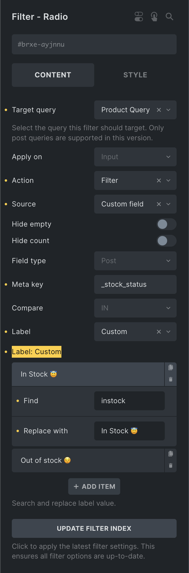 Section titled “Update Filter Index”Applicable for checkbox, datepicker, radio, range, and select elements inside the builder. Also available from the WordPress dashboard under Bricks > Settings > Query filters.