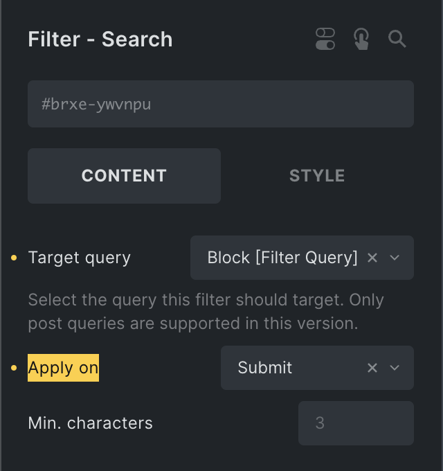 Section titled “Apply Filter On “Input” Or “Submit””By default, any change you apply to a filter, such as selecting a different radio filter option or a checkbox filter value, updates the target query. You can change this behavior by setting the “Apply to” control to “Submit.” This way, the query will only be updated by clicking the “Filter - Submit” element connected to the same Target Query.