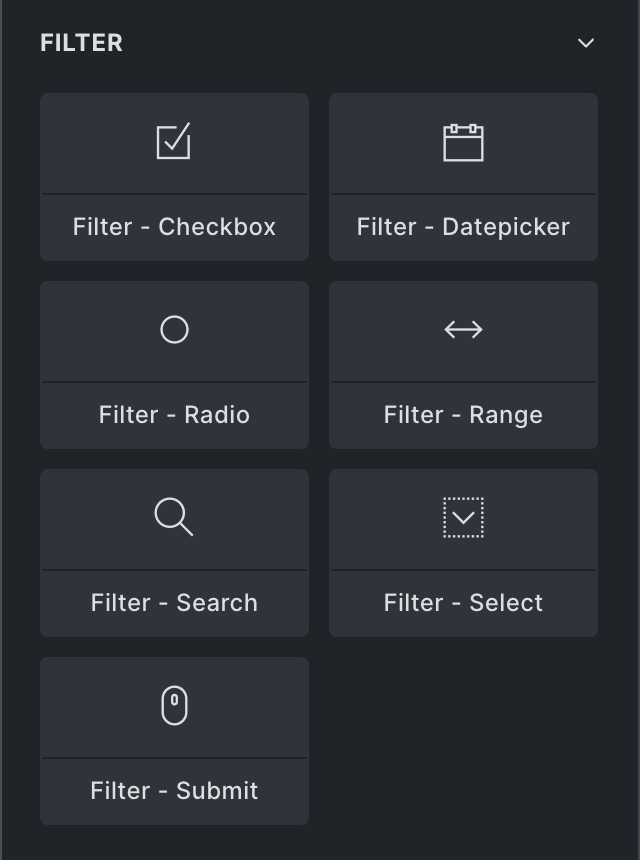 Once enabled, a new “Filter” element group with all filter elements becomes available in the builder elements panel.