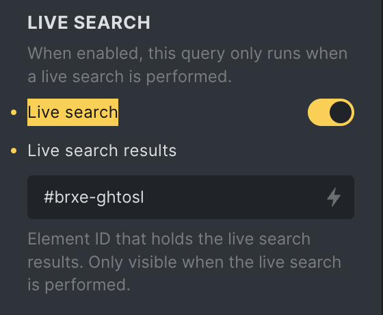 Then, copy its element ID (e.g. #brxe-dx44gp), return to your query settings, and paste this element ID from your clipboard into the Live search results text input field.