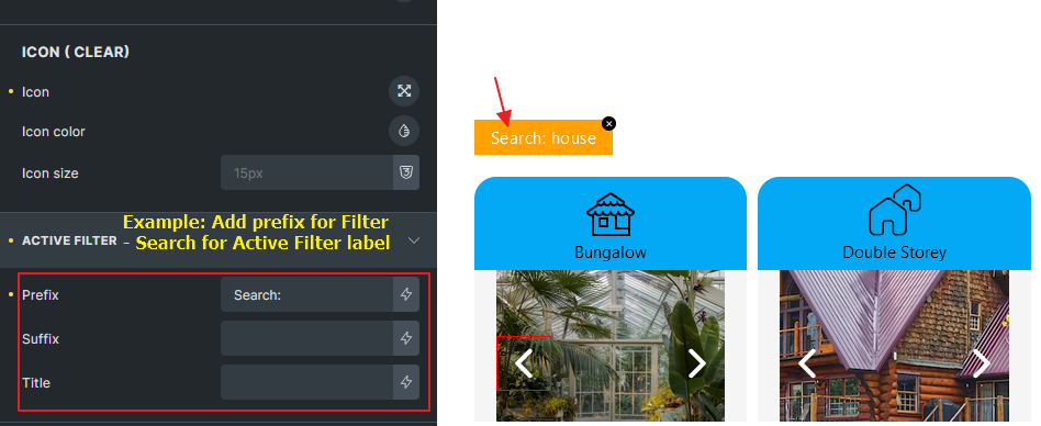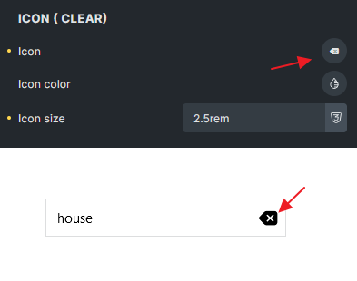 - Icon (Clear): Set an icon so the search value will be clearable by clicking on it. (@since 1.11)