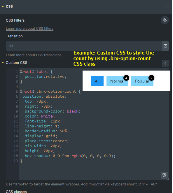 - Hide Count Bracket: Remove the brackets surrounding the count value. You can style the count by targeting