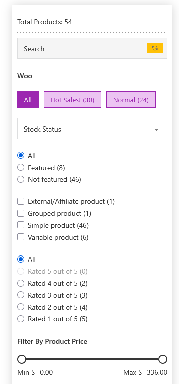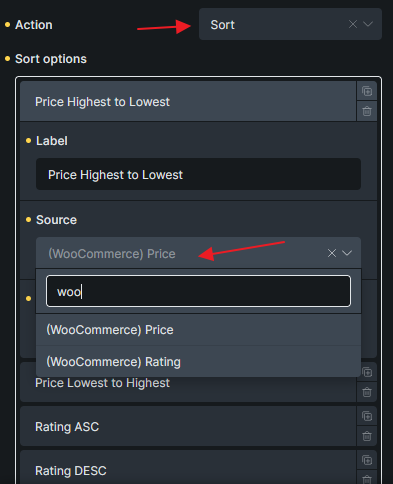 Section titled “WooCommerce Filter Support (Source)”Starting from version 2.0, you can now choose WooCommerce as a Filter Source if WooCommerce is installed on your website.