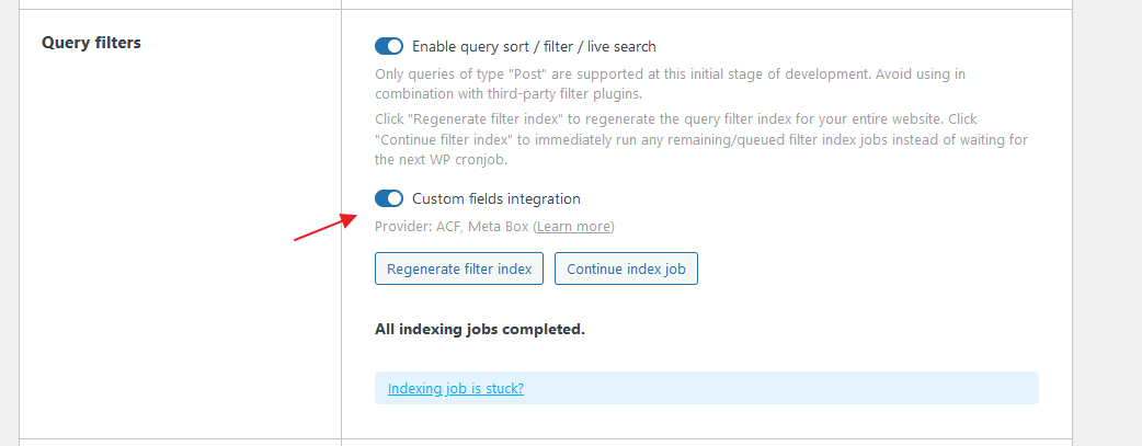 Section titled “Custom Fields Integrations”Starting with version 1.11.1, Bricks introduced a Custom Fields Integrations feature, which you can enable under Bricks > Settings > Query Filters. When this setting is turned on, Bricks can retrieve settings from supported custom field providers, allowing it to index field values accurately and generate query parameters for filtering—even for fields stored in serialized format, which wasn’t previously possible.