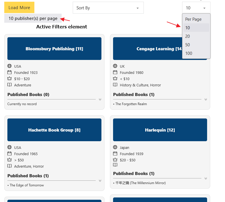 By default, the available options are 10, 20, 50, and 100. However, you can customize these values using the “Options: Results Per Page” control. URL parameter will be generated and supported too like other filter elements.