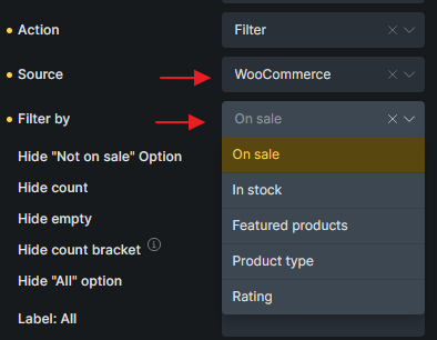 Once selected, each filter element will display additional WooCommerce-specific options depending on the filter element and action mode.