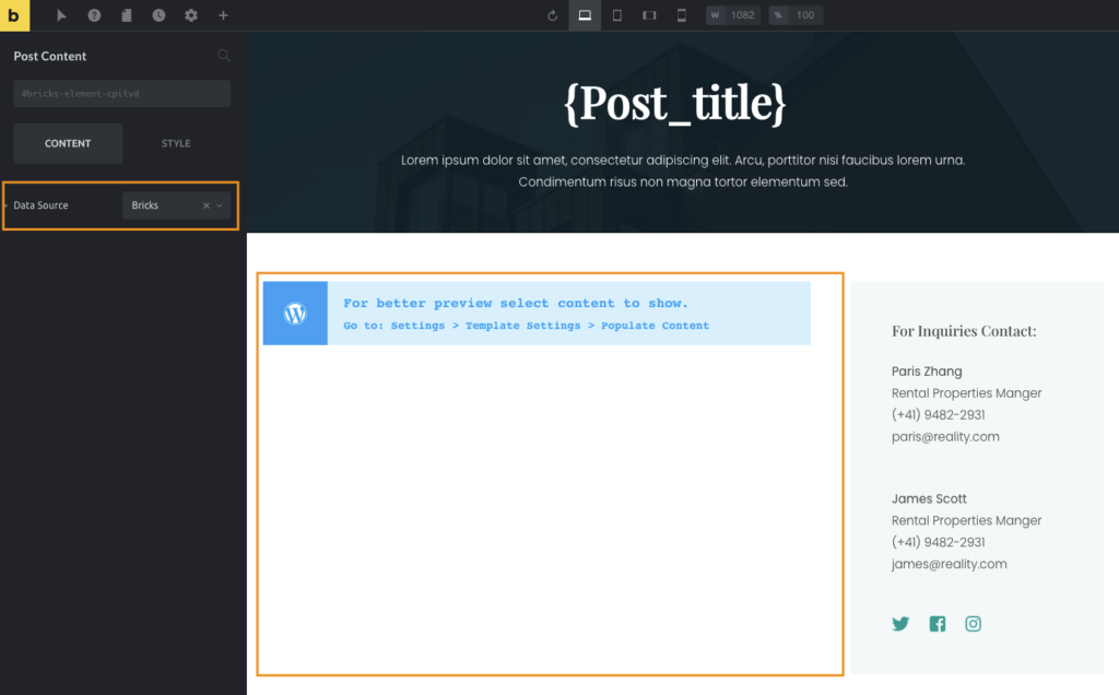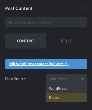 In this case, you need to set the Data Source to “Bricks” in the Post Content settings: