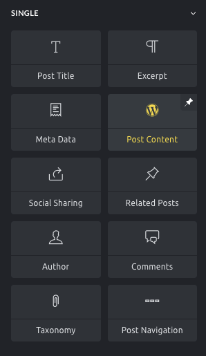 Section titled “How to use the Post Content element”Inside the builder, go to the Elements panel and look for the Post Content element in the Single elements group or use the element search bar in the panel header. Click or drag the Post Content element onto the canvas.