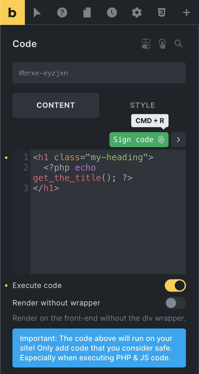 - Code retrieval for execution: When the code is accessed on your site, Bricks retrieves the code and its stored hash signature from the database.