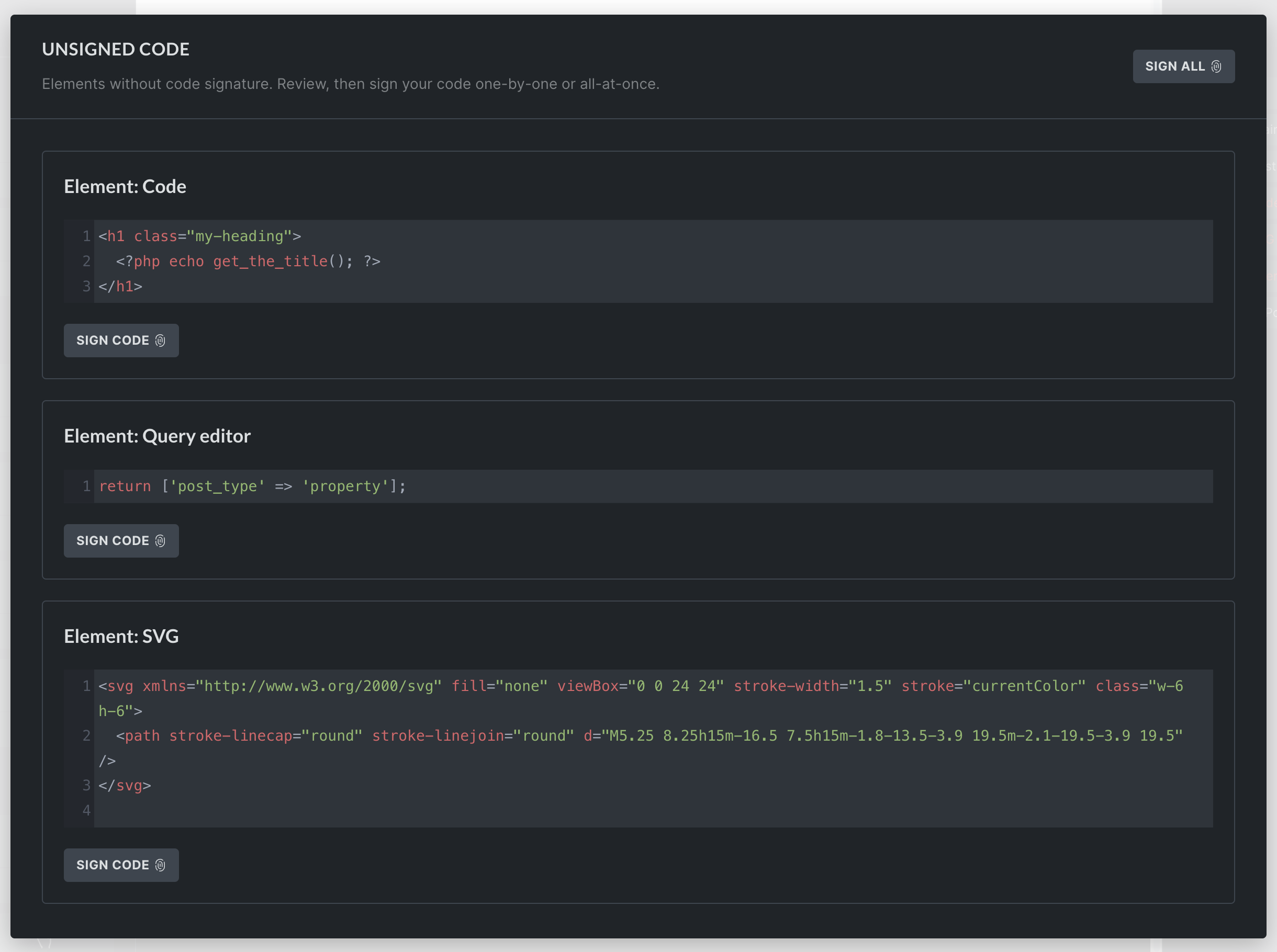 Section titled “View & sign unsigned code in bulk”You can also view and sign all elements with unsigned code on the current page by clicking the “fingerprint” icon at the top of the structure panel. The same icon is also available on individual unsigned elements in the structure panel.