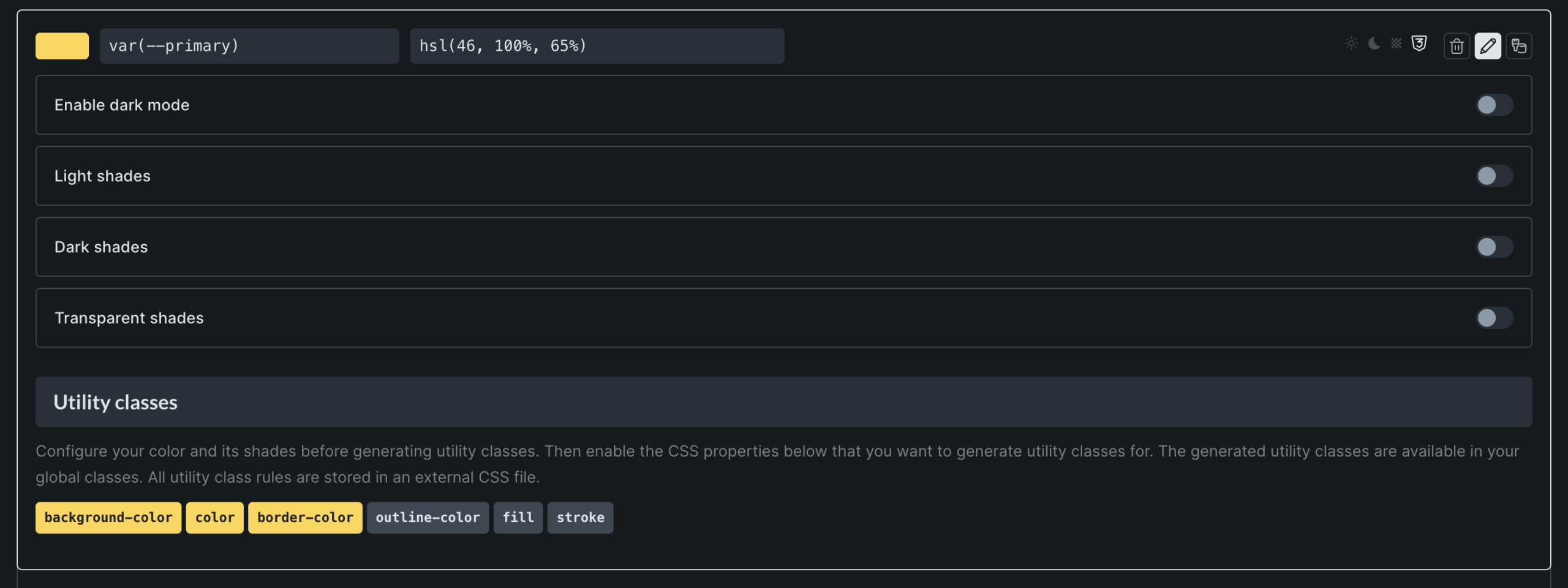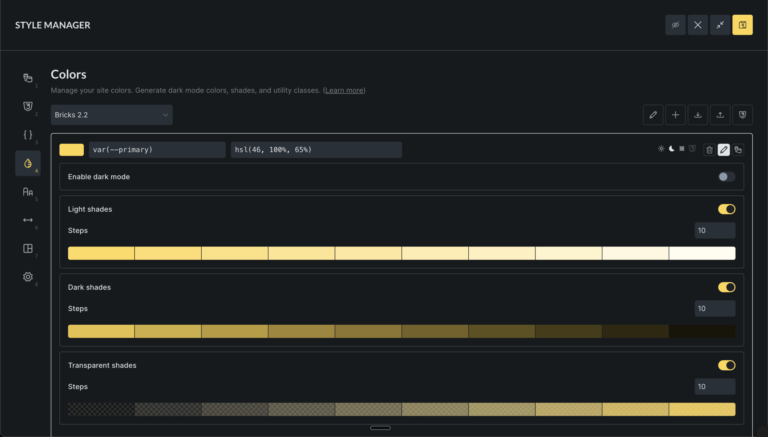 The Color Manager lets you define and maintain color tokens for your site. Each color is stored as a CSS variable and can optionally support dark mode, shades, harmonies, and utility classes.