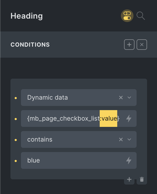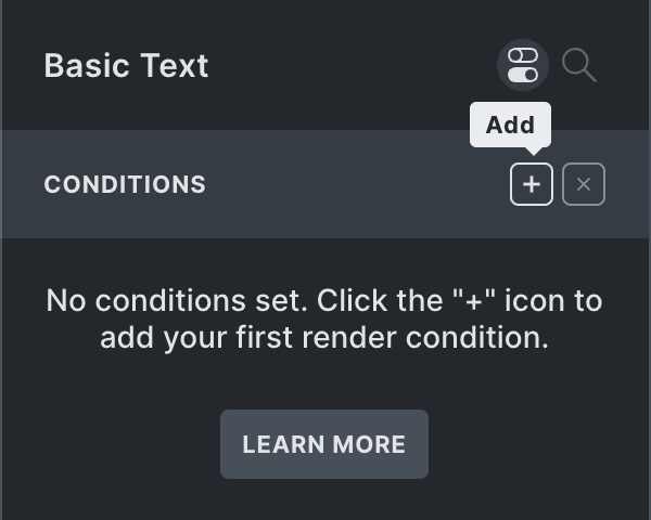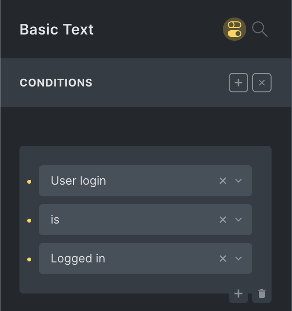 Section titled “Accessing conditions”When editing an element, click the “Conditions” (toggle) icon in the panel header to open/close the element conditions interface. You’ll see the “Conditions” toggle icon in the structure panel if an element has conditions. Click the icon to jump right into the conditions interface for this element.