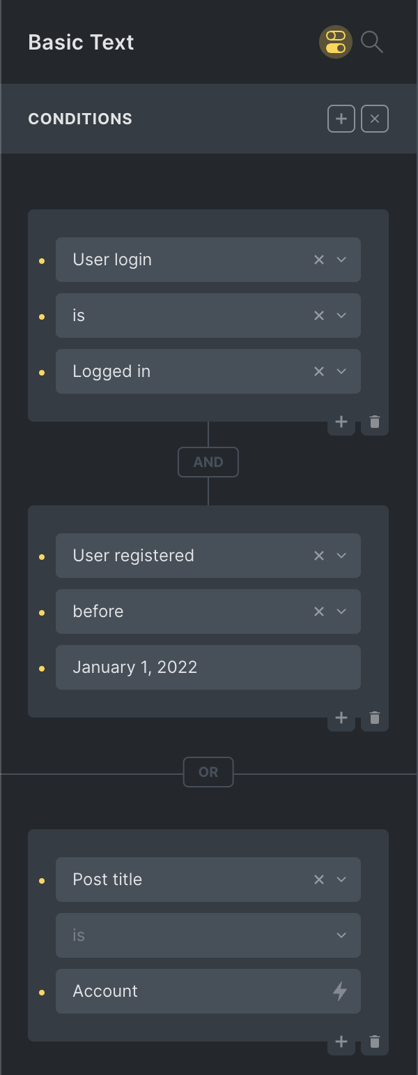 Section titled “Combining AND & OR conditions”Let’s extend the conditions for this element by checking if the logged-in user has been registered before the 1st of Jan 2022.