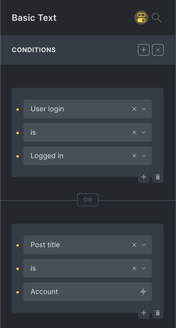 Section titled “How element conditions work”At least one set of conditions must be fulfilled to render the element. This means all conditions inside a condition “set” must be evaluated to be true.