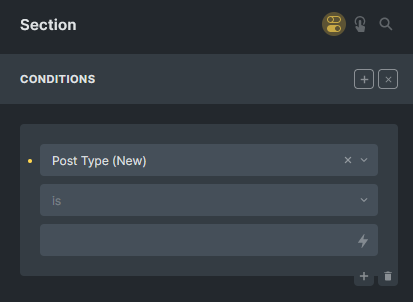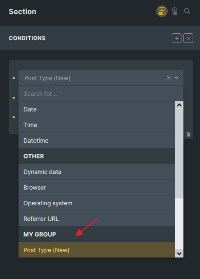add_filter( 'bricks/conditions/options', 'add_my_custom_condition' );function add_my_custom_condition( $options ) { // Ensure key is unique, and that group exists $options[] = [ 'key' => 'my_post_type', 'label' => esc_html__( 'Post Type (New)', 'my-plugin' ), 'group' => 'my_group', 'compare' => [ 'type' => 'select', 'options' => [ '==' => esc_html__( 'is', 'my-plugin' ), '!=' => esc_html__( 'is not', 'my-plugin' ), ], 'placeholder' => esc_html__( 'is', 'my-plugin' ), ], 'value' => [ 'type' => 'text', ], ];