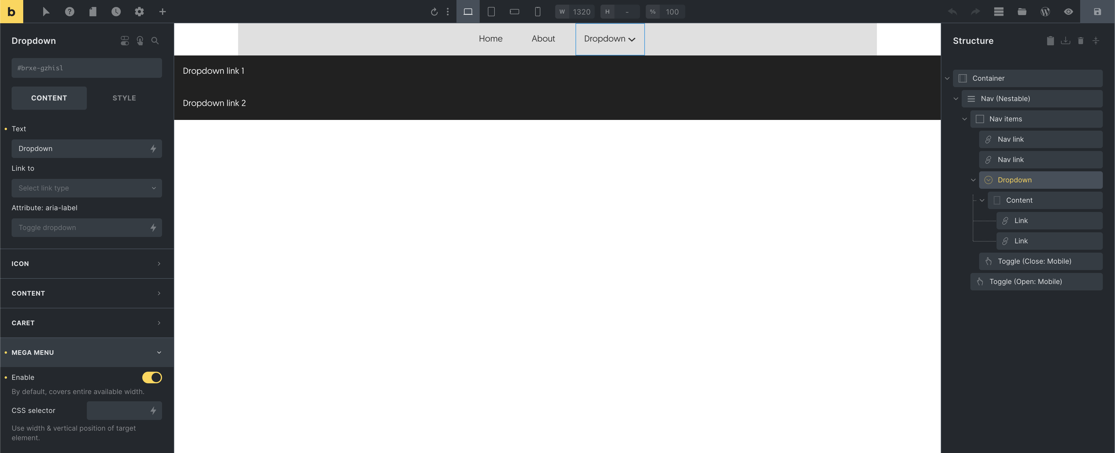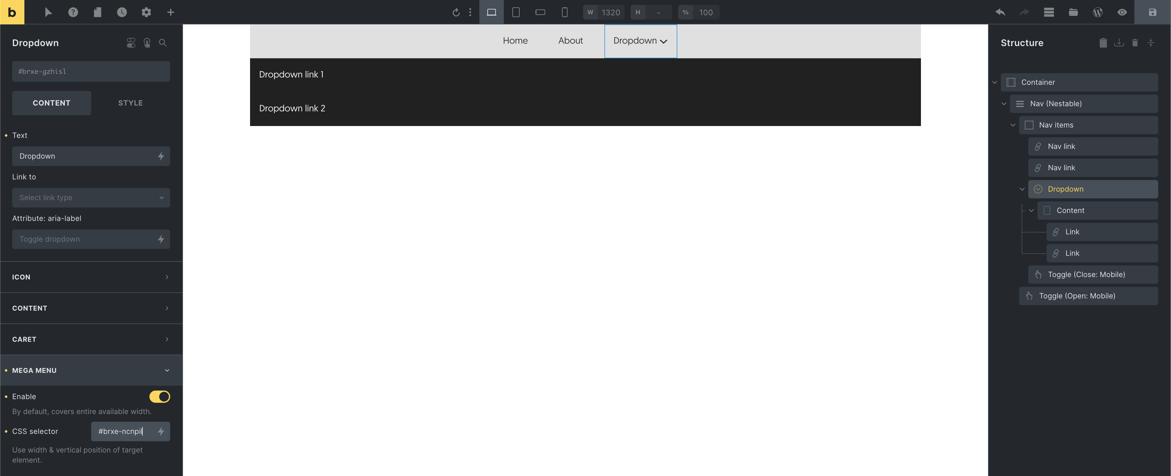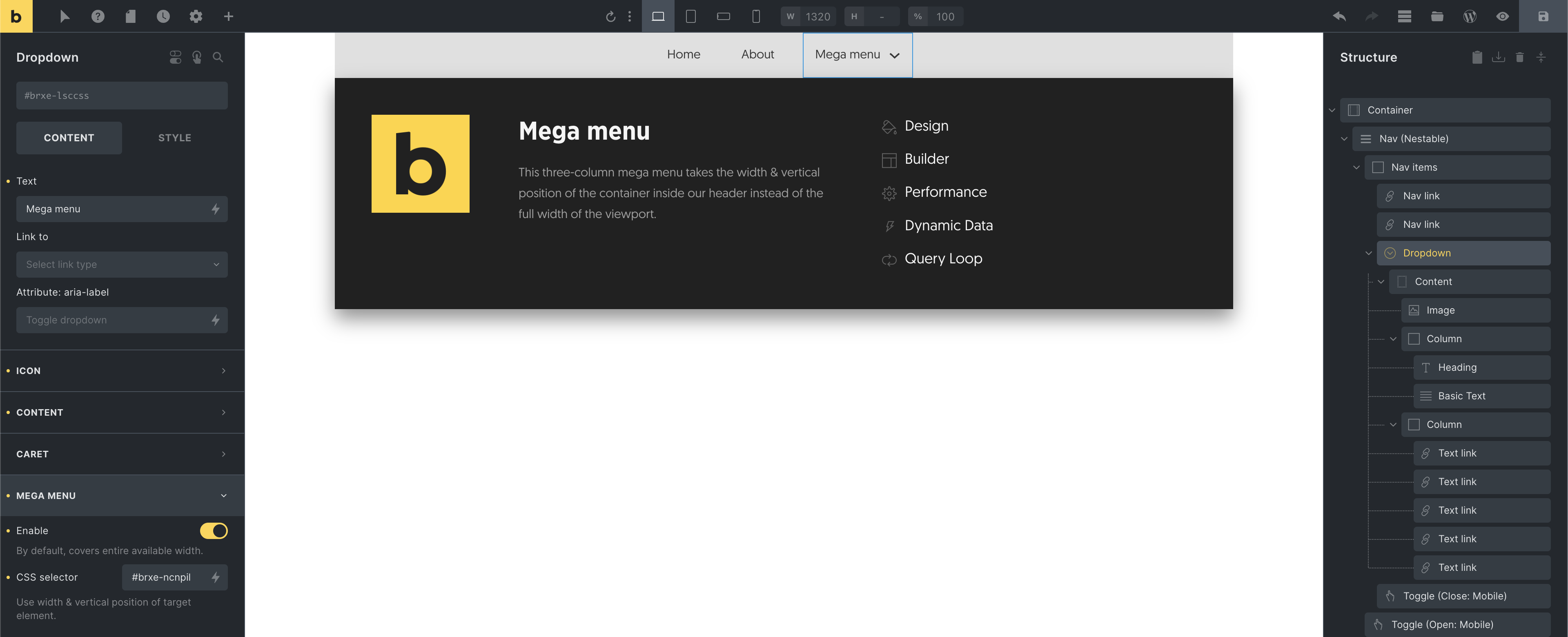 Section titled “Mega menus”Creating mega menus with Bricks couldn’t be easier. Just “Enable” the mega menu setting when editing the “Dropdown” element of your choice.