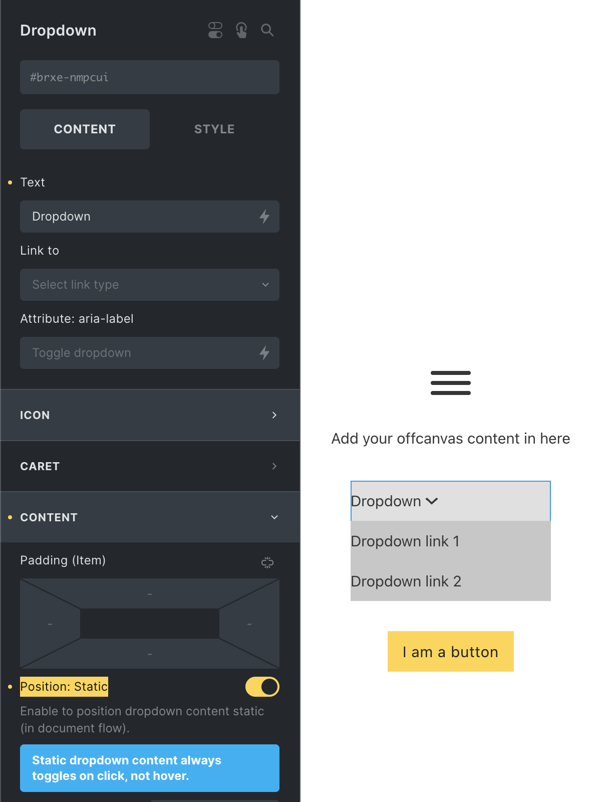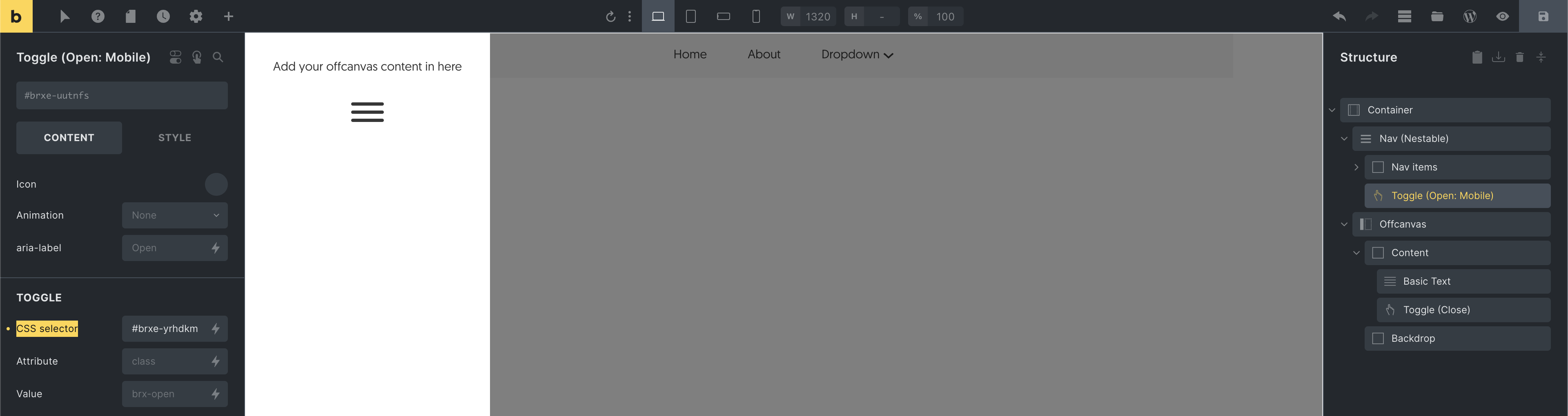 The Toggle automatically detects the Offcanvas or Nav (Nestable) context it is placed in. If you have multiple toggleable elements or want to trigger a specific one, simply enter its “CSS selector” into the control field.