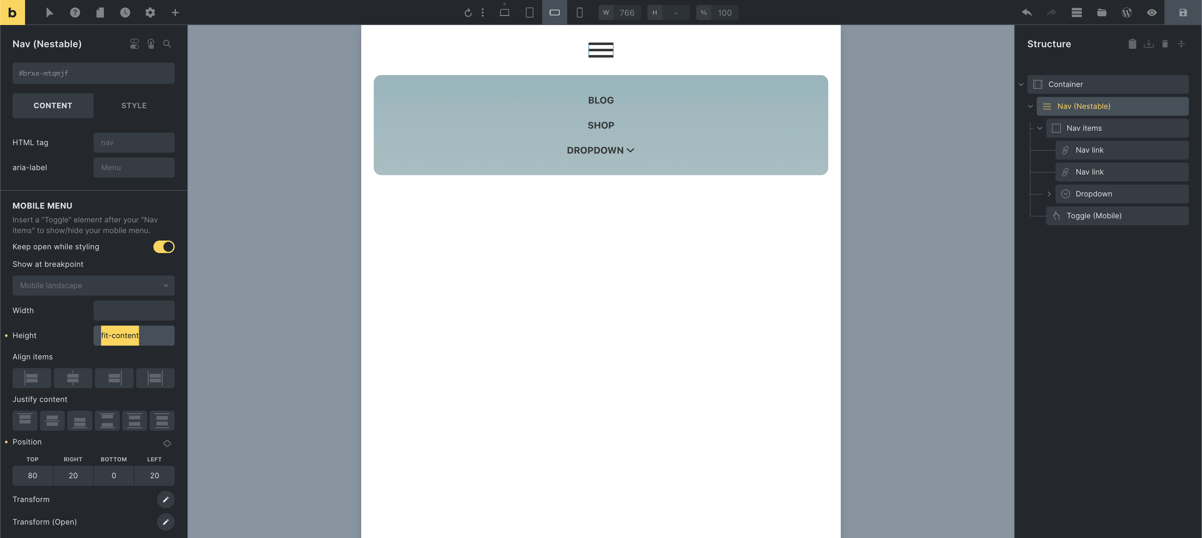 Section titled “Non-fullscreen mobile menus”To show the default mobile menu without it covering the full screen, edit your Nav (nestable) and set the “Height” under “Mobile menu” to fit-content.