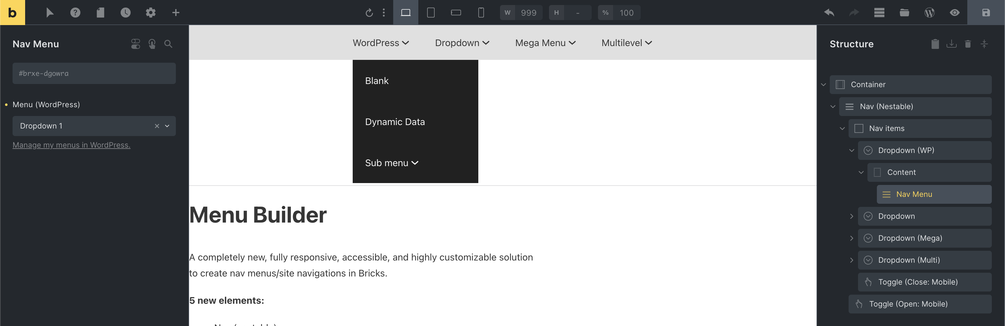 Bricks 1.8 introduced a completely new, fully responsive, accessible, and highly customizable suite of elements to create nav menus/site navigations in Bricks.