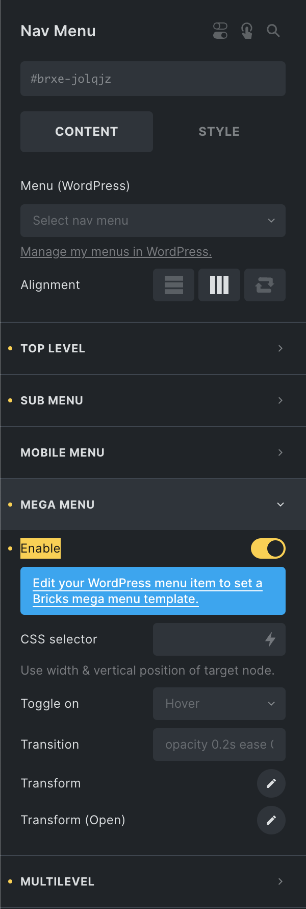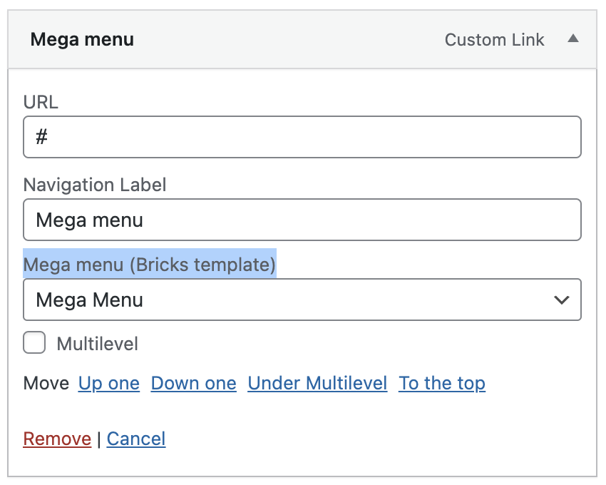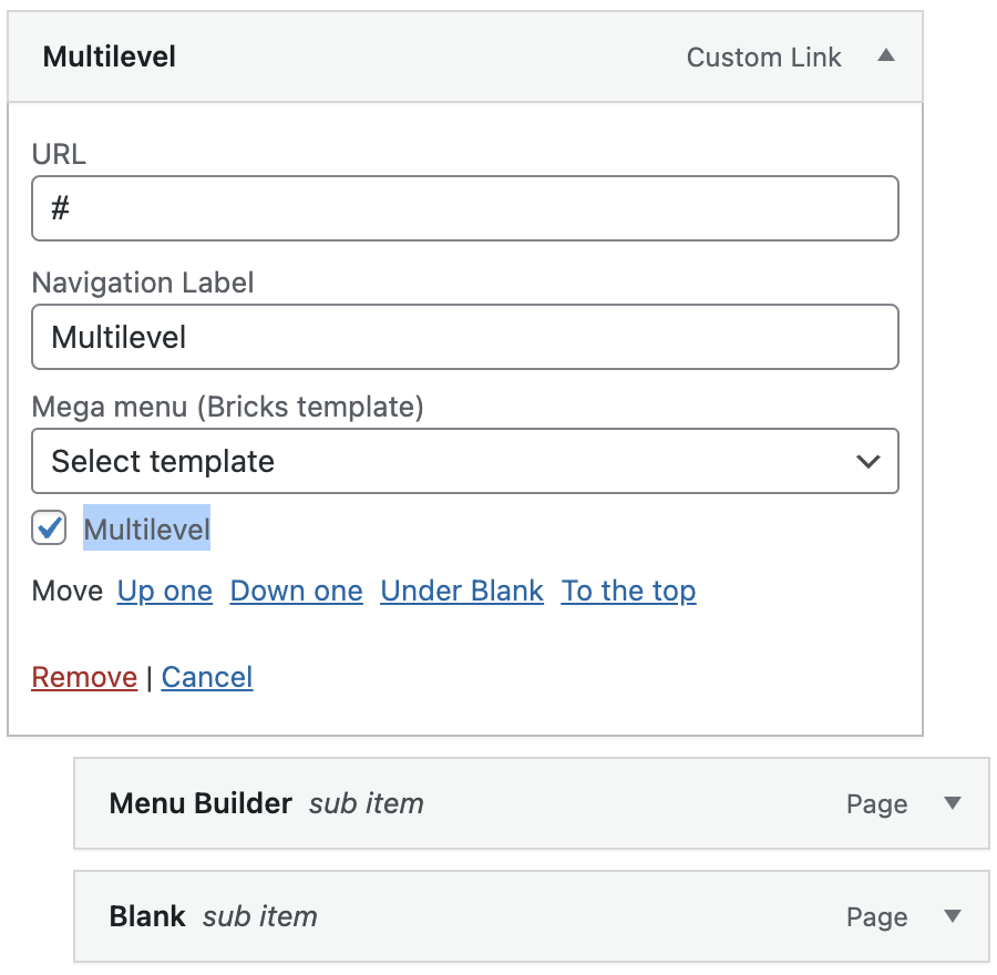 Section titled “WordPress multilevel menus”Bricks 1.8 lets you turn your WordPress sub menus into multilevel menus too. Simply enable the “Multilevel” setting of your “Nav menu” element, and then activate the “Multilevel” setting of your WordPress menu items under “Appearance > Menus” like this: