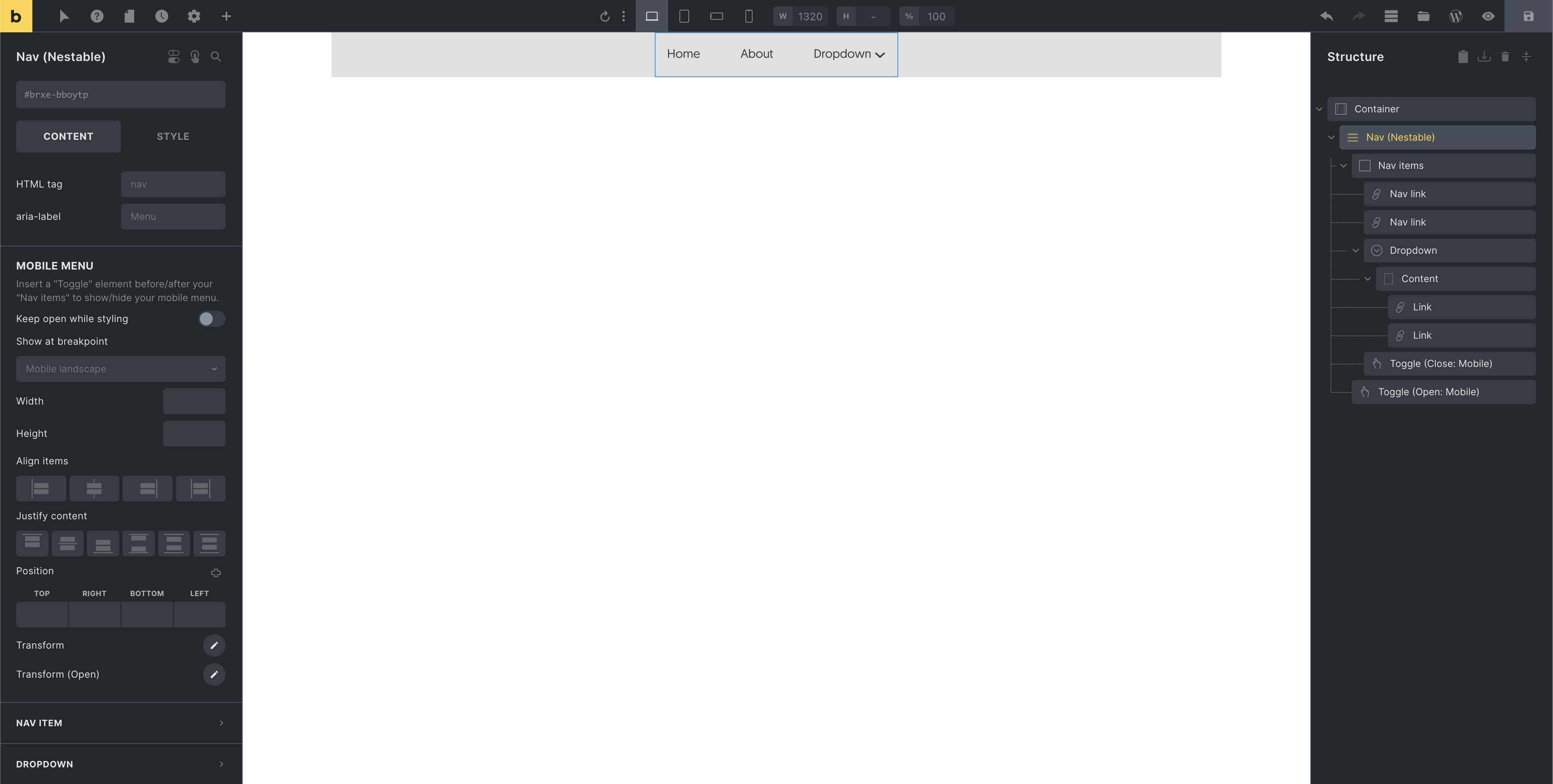 Section titled “Default mobile menu structure”By default, the mobile menu becomes visible at the “Mobile landscape” breakpoint. Meaning instead of displaying the top-level menu items, a (hamburger) Toggle becomes visible that opens the mobile menu when you click on it. You can, of course, select any other breakpoint to start showing your mobile menu when editing your Nav nestable element.