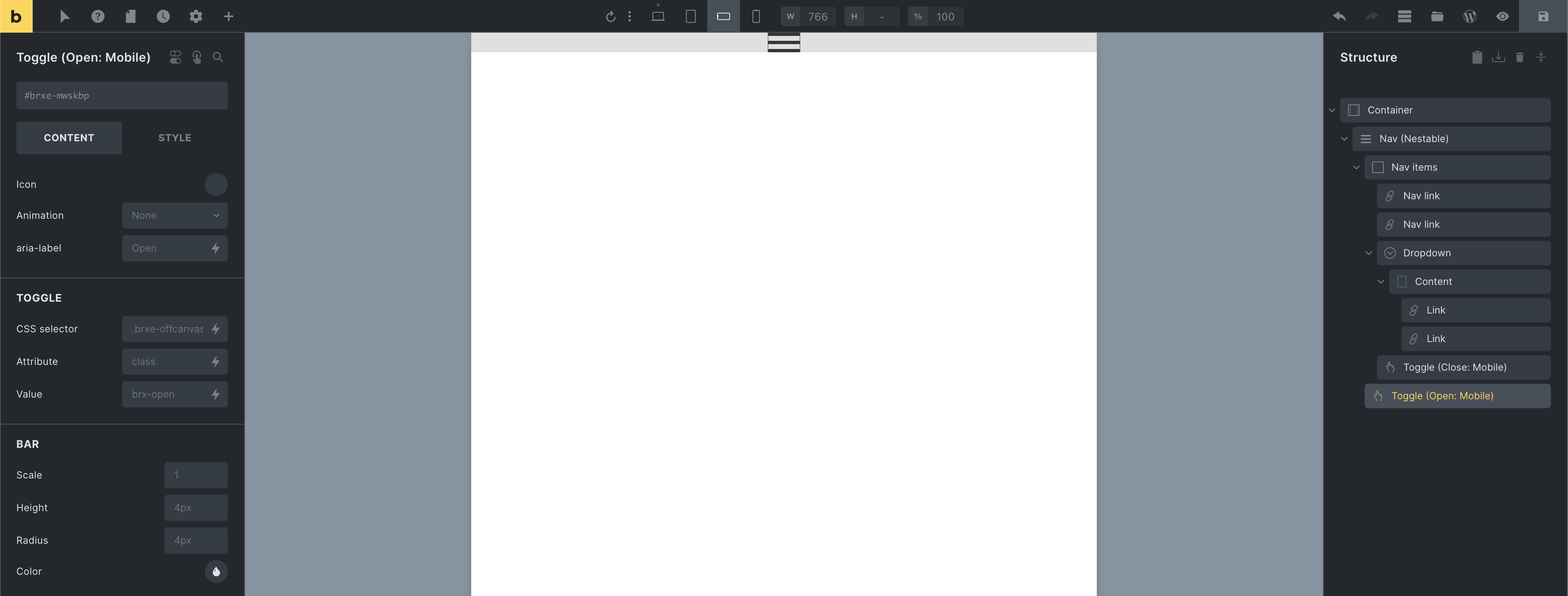 The Toggle element labeled “Toggle (Open: Mobile)” opens the mobile menu (highlighted in the screenshot above).