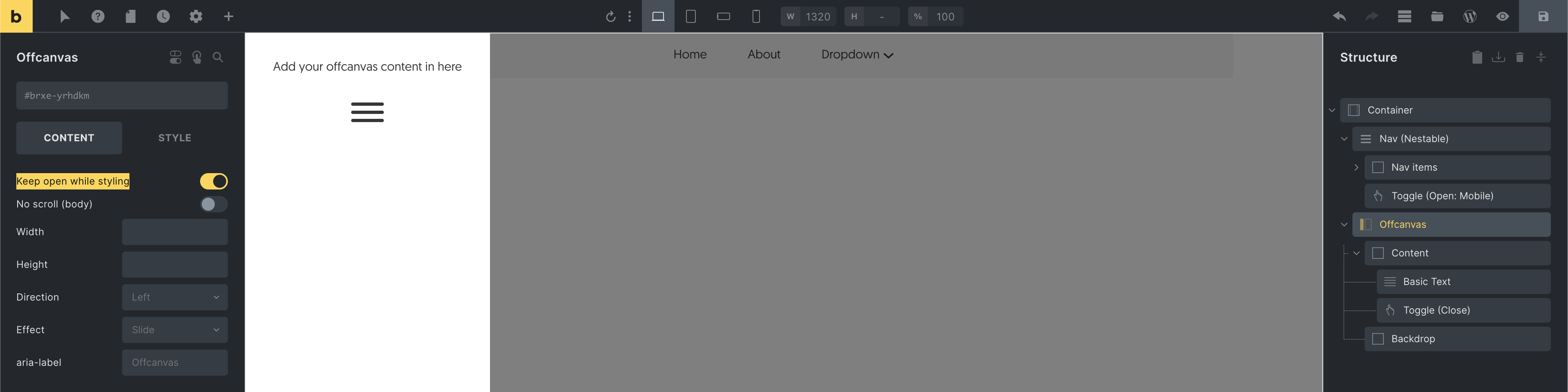 Offcanvas: Enable the “Keep open while styling” setting while editing the Offcanvas content