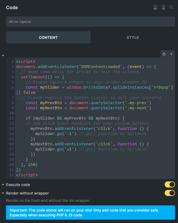 <script>document.addEventListener('DOMContentLoaded', (event) => { // Give some times for Bricks to init the sliders setTimeout(() => { // Please replace rrbqsp to your Slider element ID !!NOT CSS ID!! const mySlider = window.bricksData?.splideInstances['rrbqsp'] || false // Please replace the button classes to suit your scenario const myPrevBtn = document.querySelector('.my-prev') const myNextBtn = document.querySelector('.my-next')