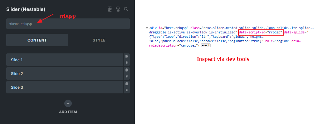 You must first identify the Nestable Slider element’s unique ID to retrieve the appropriate instance from the variable. You can find this ID within the builder when editing this element or through your browsers’ developer tools.
