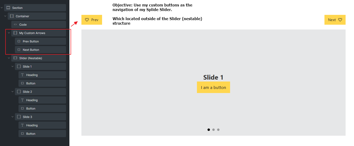 Section titled “Custom navigation arrows outside the slider”Objective: Implement custom navigation buttons located outside of the Nestable Slider.