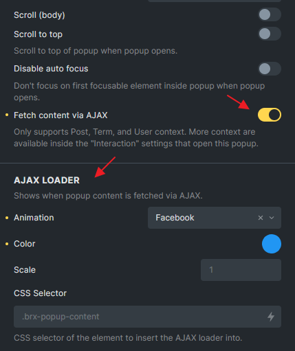 Section titled “Enabling AJAX content fetching for popups”When editing a popup template, simply enable the “Fetch content via AJAX” option. You can also specify an AJAX loader animation, which is placed inside the popup’s .brx-popup-content by default. Keep in mind that for AJAX rendering, context is vital. Dynamic data from repeater rows (like ACF or Metabox) can’t be displayed as they lack unique IDs, such as posts, terms, or users.