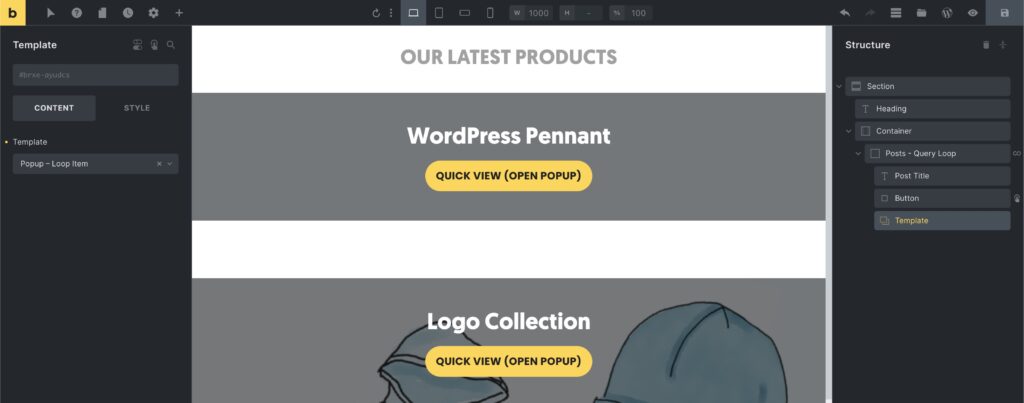 A looping product quick view popup structure in Bricks