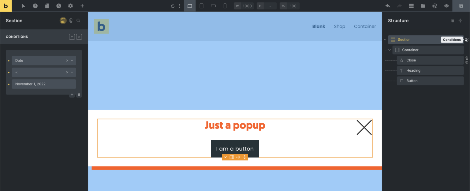 To only show a popup before November 1st, 2022, you’d set the following element condition on the outermost layout element of your popup: