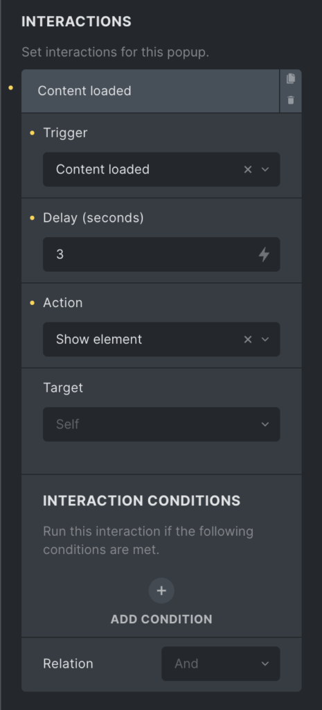 A commonly used trigger is to show the popup once the content is loaded (e.g. newsletter popup, special offers, etc.). To do that, set a “Content loaded” interaction like so: