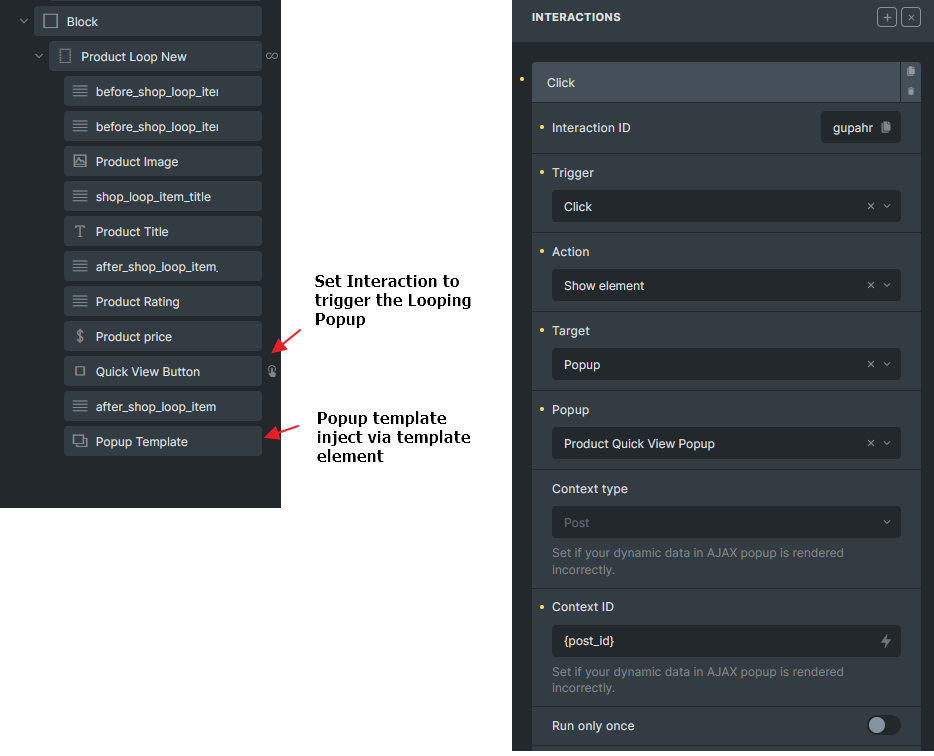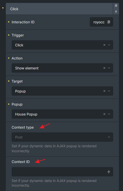 Section titled “Why are these context settings necessary?”Consider creating a product quick view popup with all the related dynamic data in the popup template. When fetching this template via AJAX, it’s crucial to inform Bricks about the current product (context). This ensures that all dynamic data populates correctly. Providing an incorrect context type and ID during the fetch can result in empty or inaccurate dynamic data. Remember that not all looping data can be the context in an AJAX popup. As an example, you cannot tell Bricks currently your context is a repeater few in N row of the repeater field.