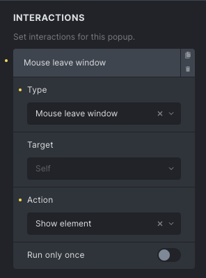Section titled “Example: Show popup when the mouse leaves the browser window (exit intent)”After setting up the popup template, and creating the layout, go to “Settings > Template Settings > Popup”, scroll down to the Interactions group, and add the following interaction: