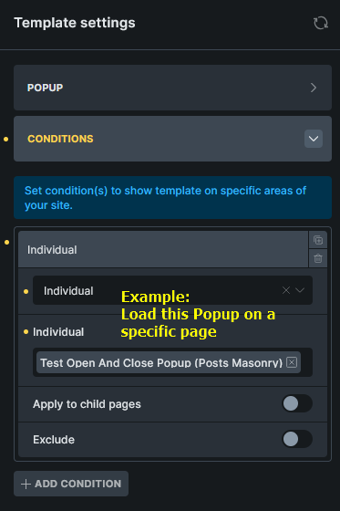 Section titled “Popup conditions”Use the template conditions inside the builder under “Settings > Template Settings > Conditions” to tell Bricks where on your website this popup should appear.