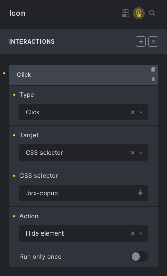 After saving this element as a Global Element, you need to use a different approach when setting the close popup interaction so it can target any popup. In this case, use “CSS selector” as the “Target”, and set the “CSS selector” to “.brx-popup”, like so:
