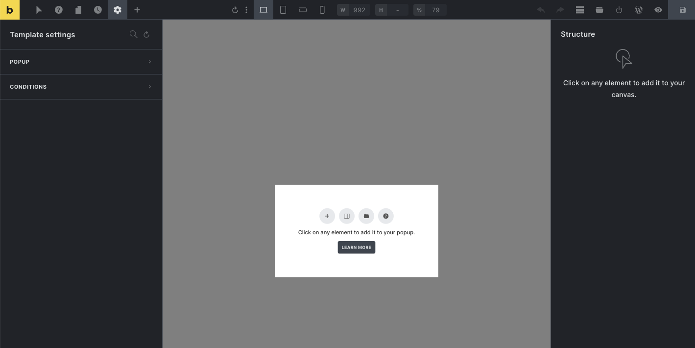 Building out the content of your popup is the same process as on any other page or template in Bricks: You simply add the elements you need to the canvas via click and/or drag & drop.