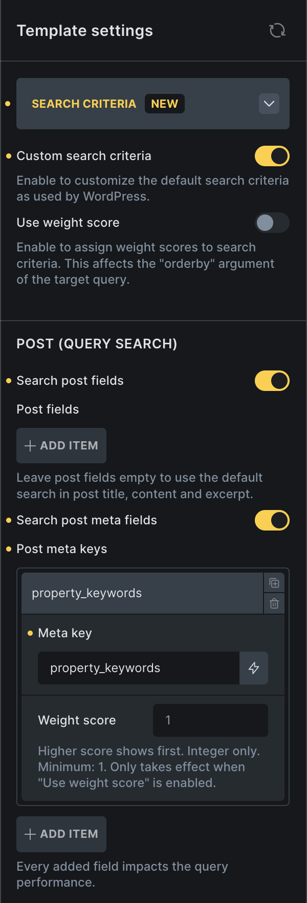 Custom search criteria: This reveals all available search settings for controlling how the native s search behaves.