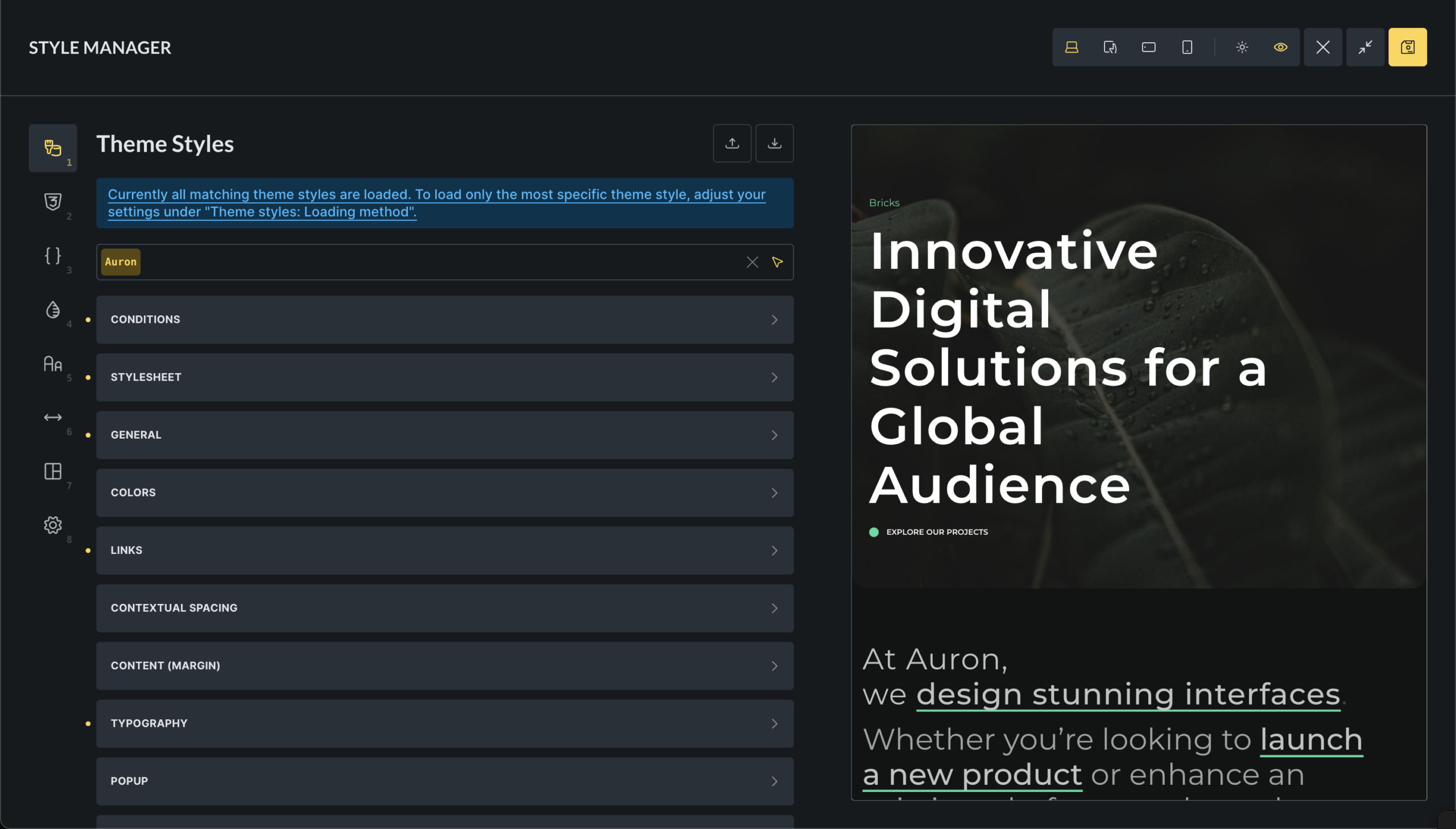 The Style Manager is the central place in Bricks for managing design system primitives and reusable styling tools. It brings together theme styles, classes, variables, colors, scales, and imported CSS into a single interface inside the builder.