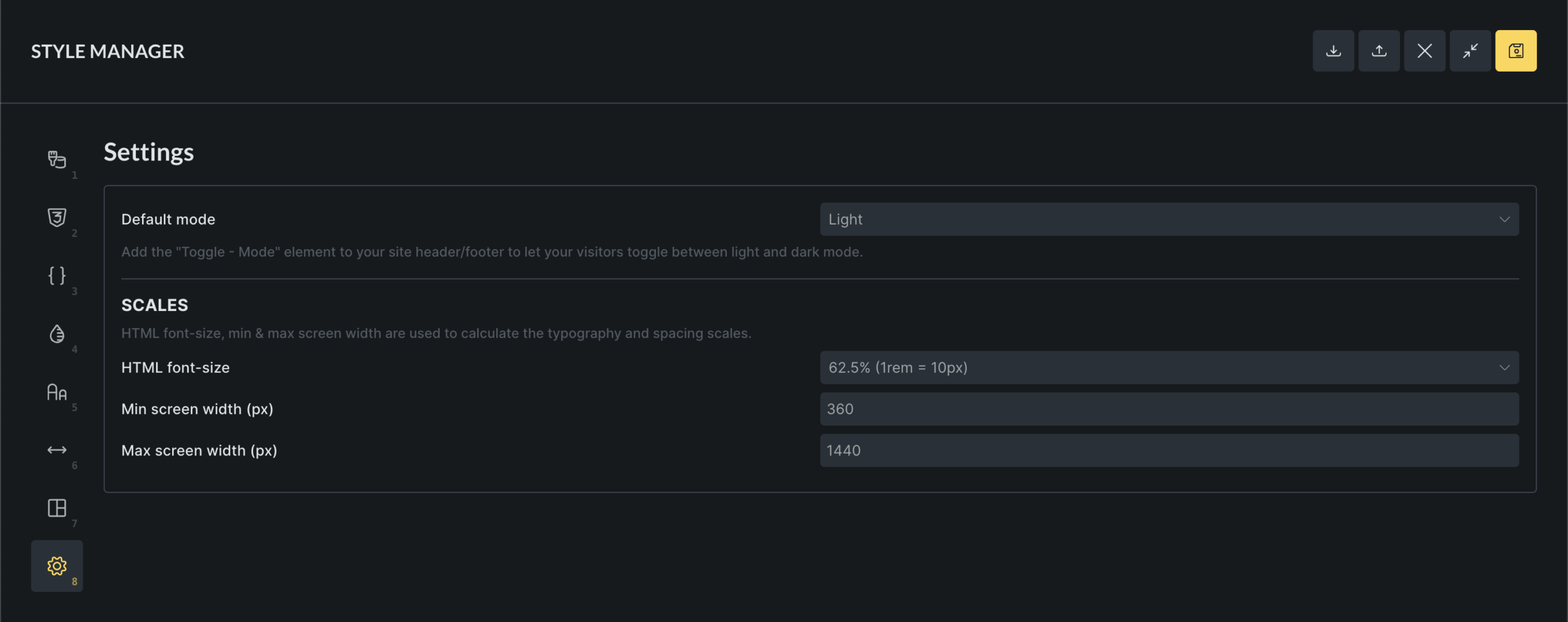 Section titled “Keyboard shortcuts”You can switch between Style Manager tabs using number keys based on their position.