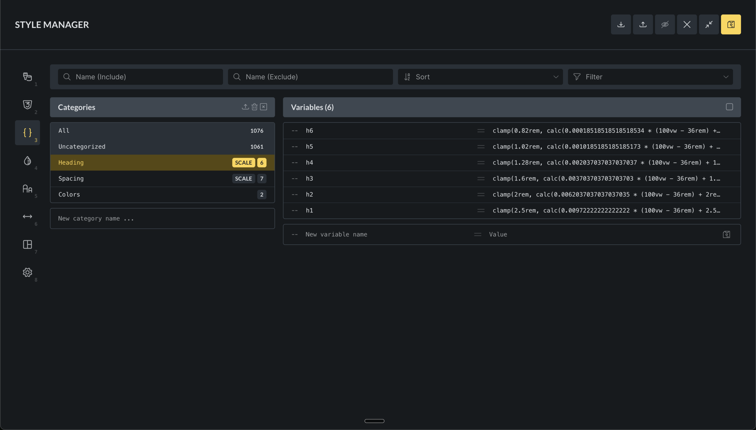 Variables can be imported from CSS or JSON, grouped into categories, and renamed.