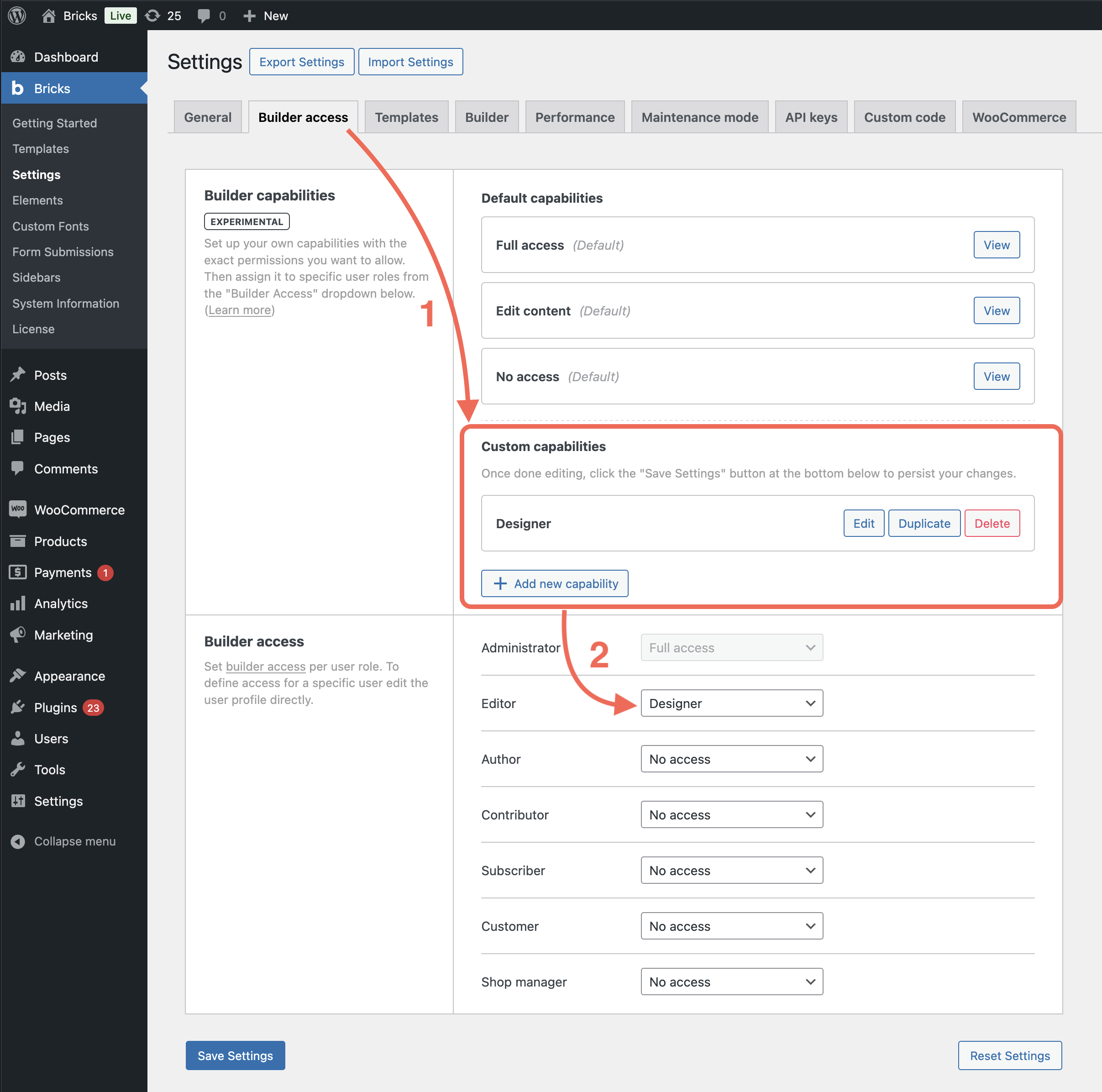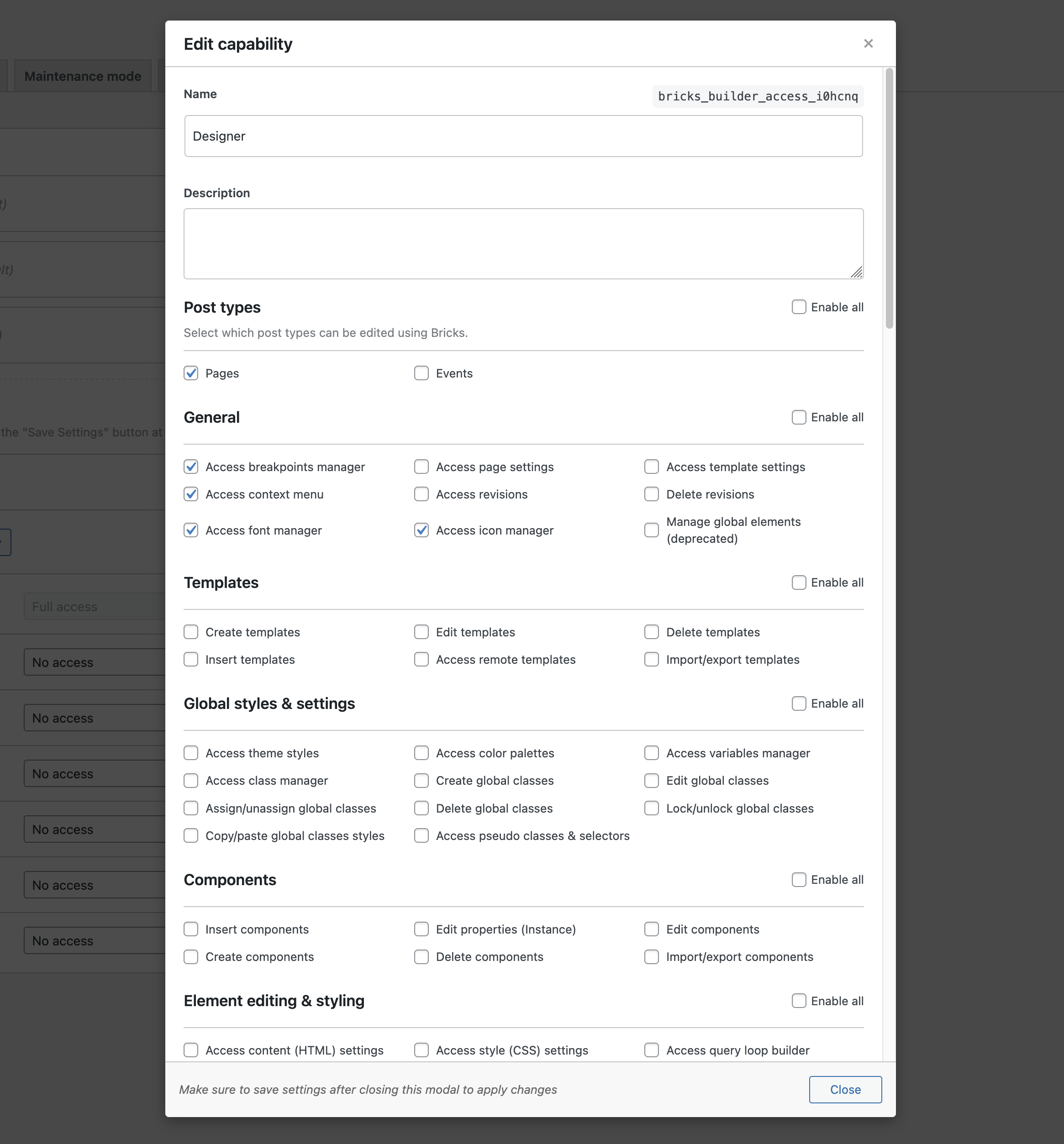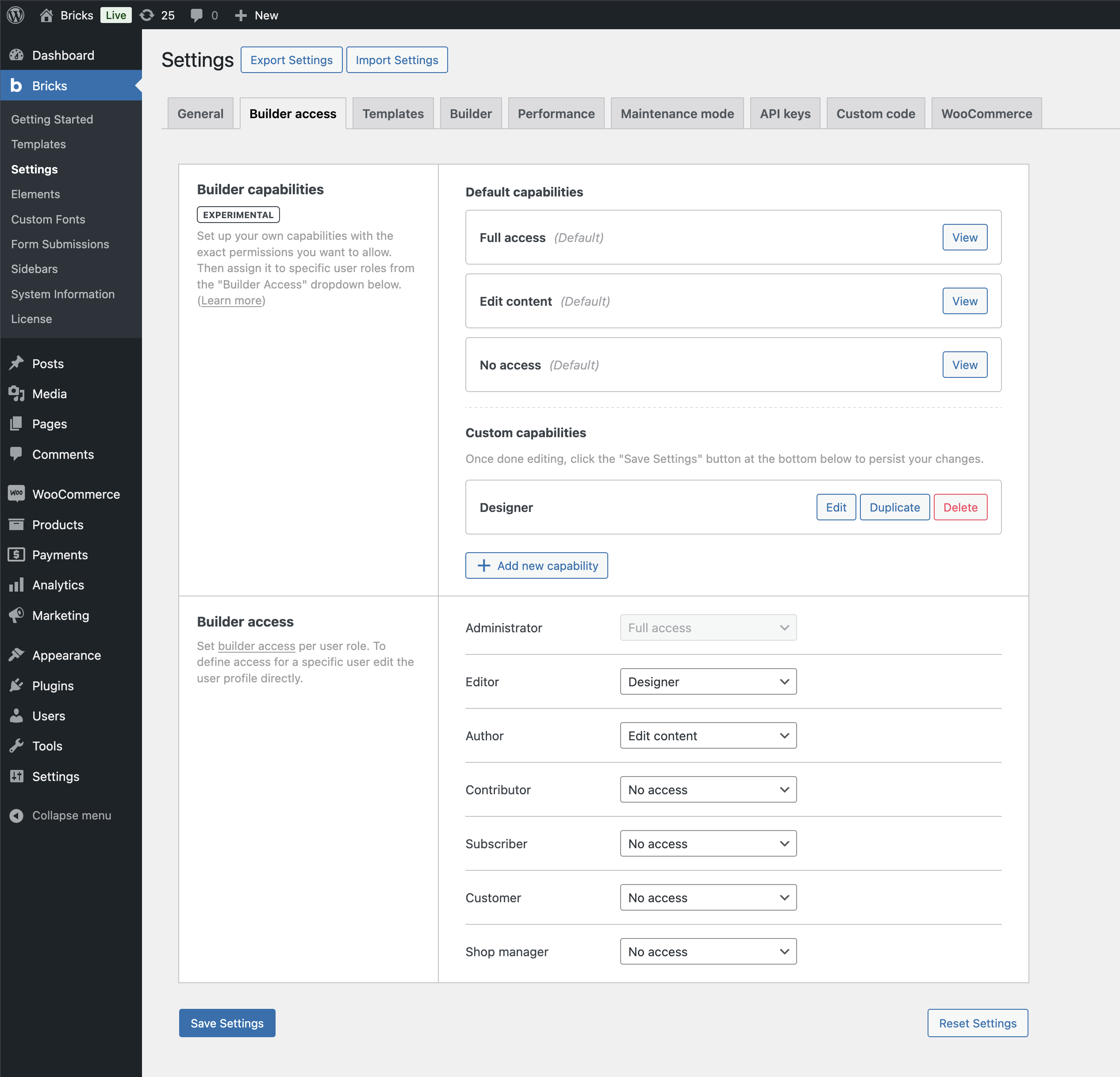 Starting at version 2.0, Bricks gives you full control over who can access the builder, and what actions they’re allowed to perform. You can either assign a predefined capability, or create your own custom capability that allows only the specific permissions you enable for it.