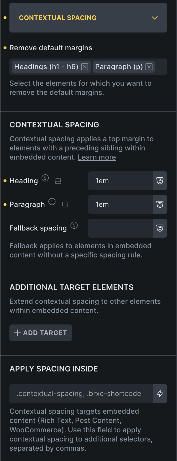 | Additional target elements | Define spacing rules for elements like ul, blockquote, or any custom selector. Lets you block margin (top, bottom) and inline padding (left, right). |