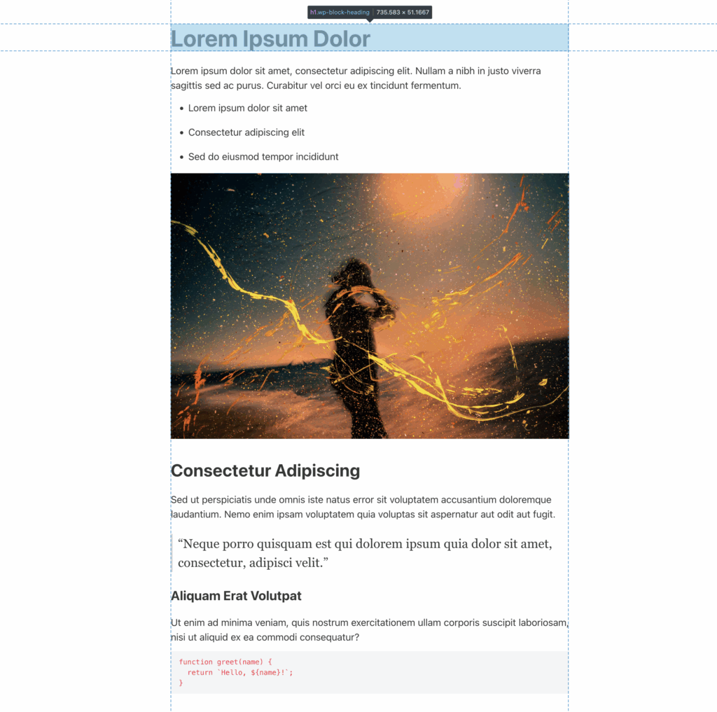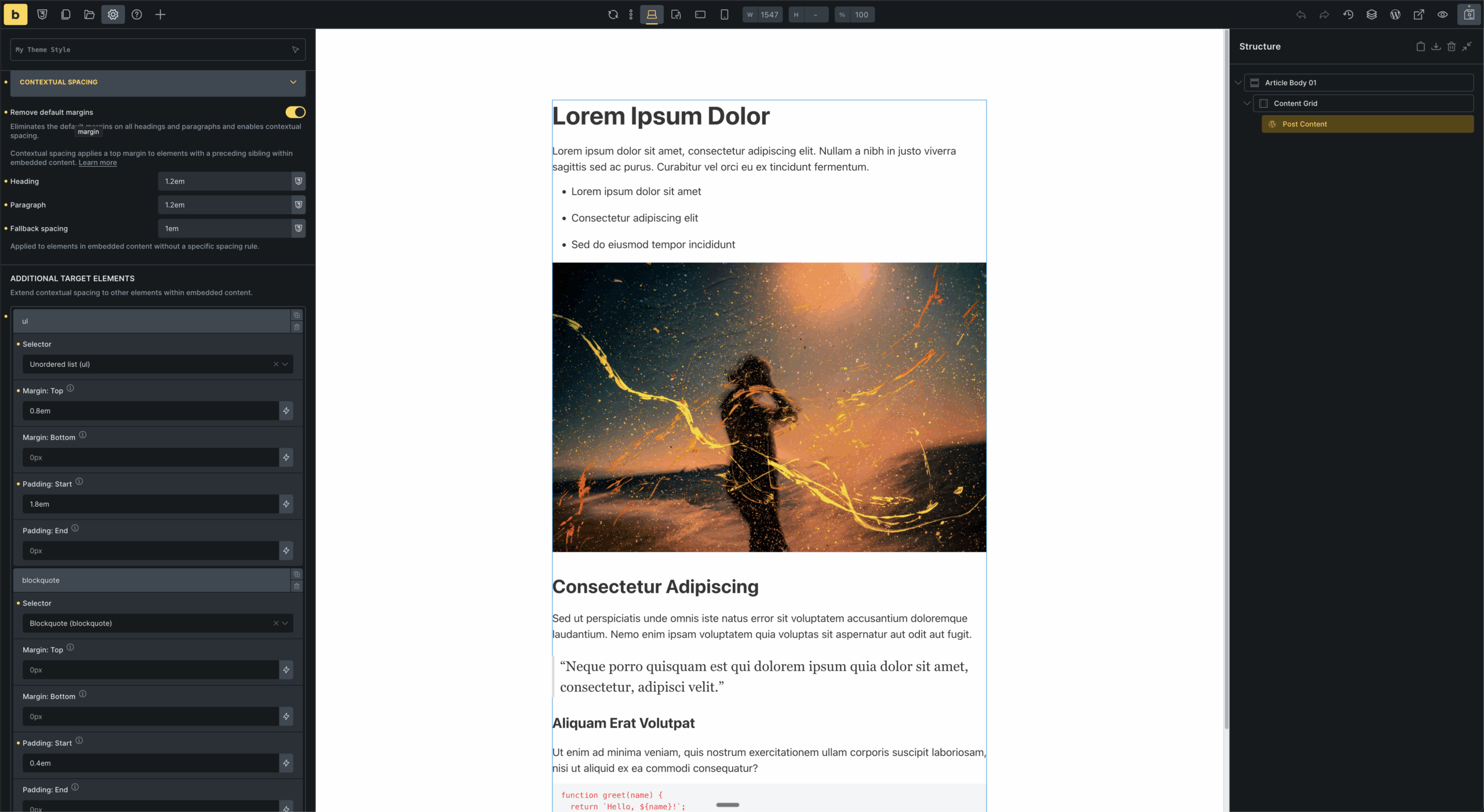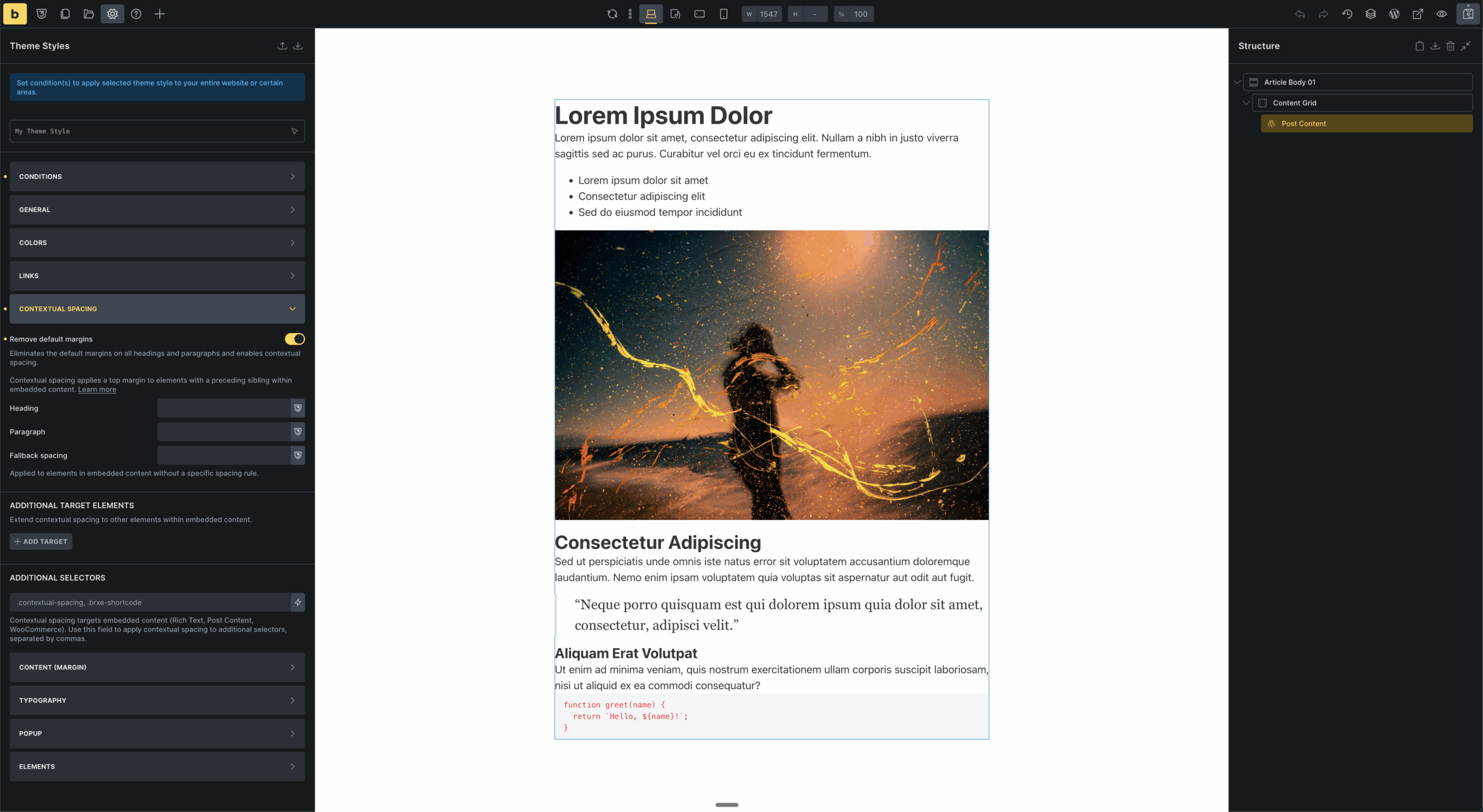Section titled “Example use case 1: Embedded post content”You’re building a single post template using a Post Content element (source: WordPress). Before enabling Contextual spacing, the post displays the default spacing added by Bricks.