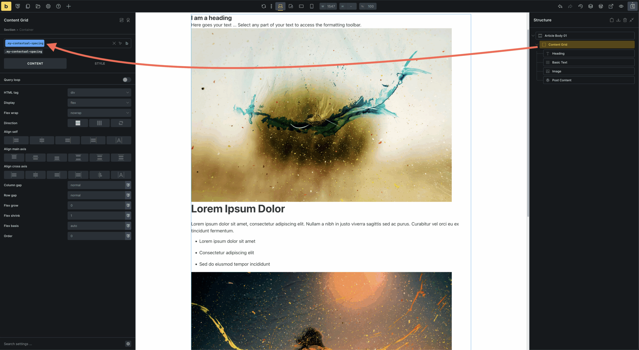 Section titled “Apply to more content areas”Add these utility classes to wrappers (i.e. Container, Div, Block elements) that hold a mix of content elements, and Bricks will apply your Contextual spacing settings to them.