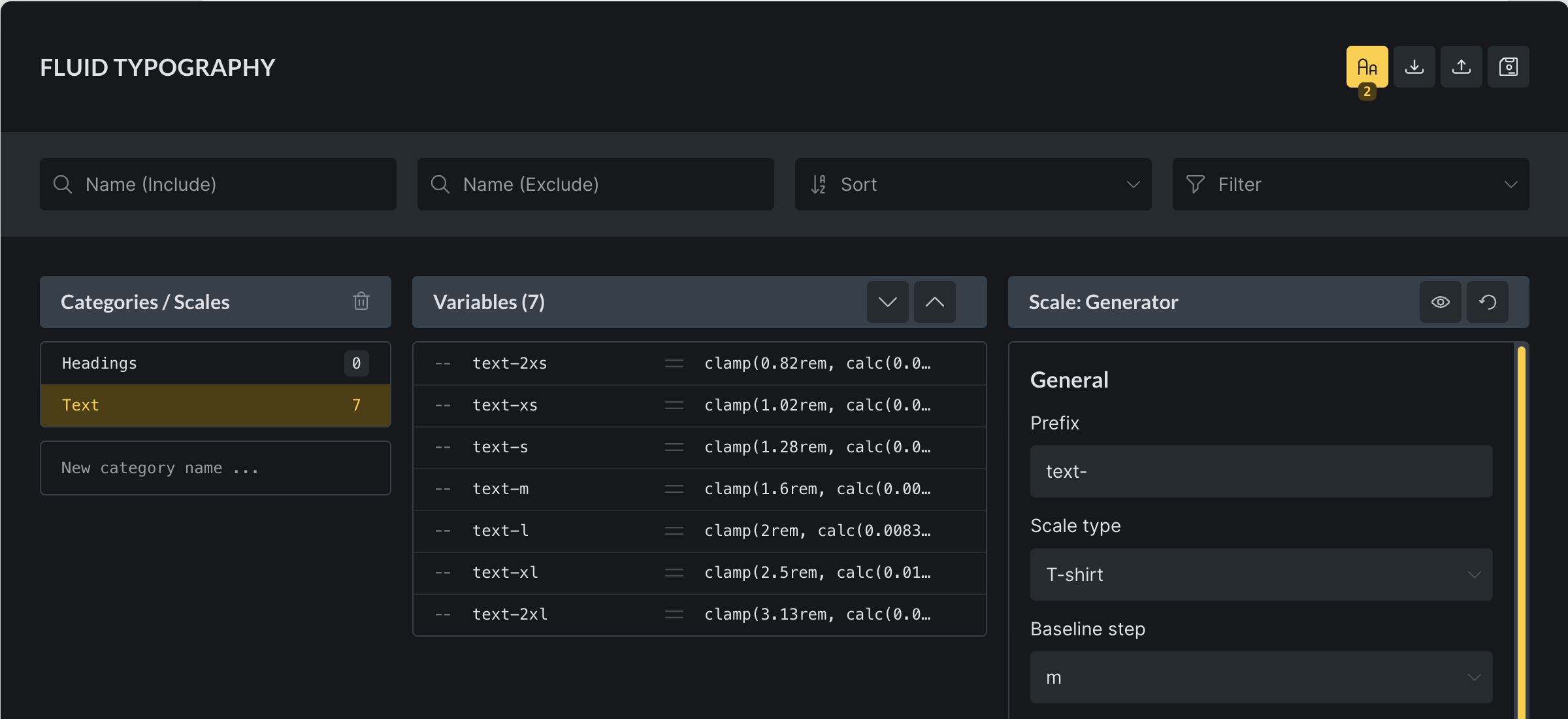 Section titled “Fluid typography variables”Fluid typography variables can be generated with the Scale Generator on the right-hand side.