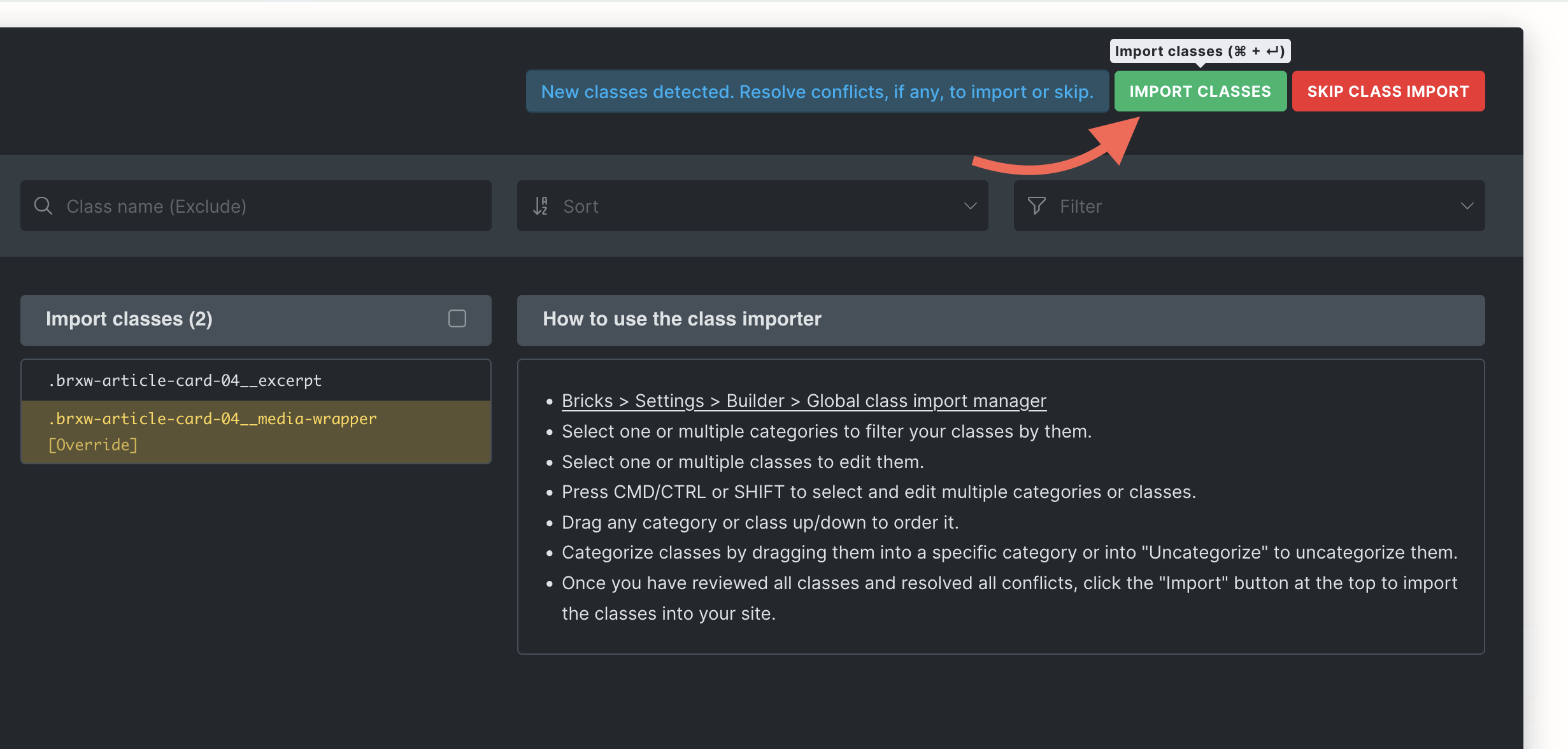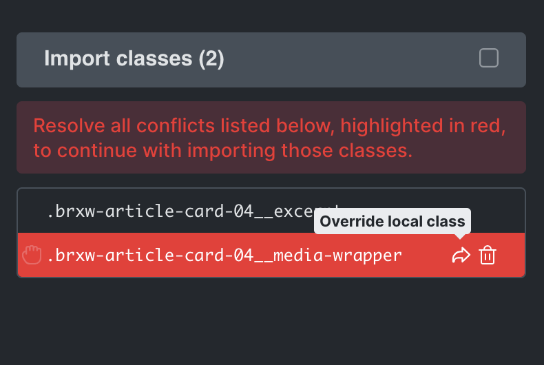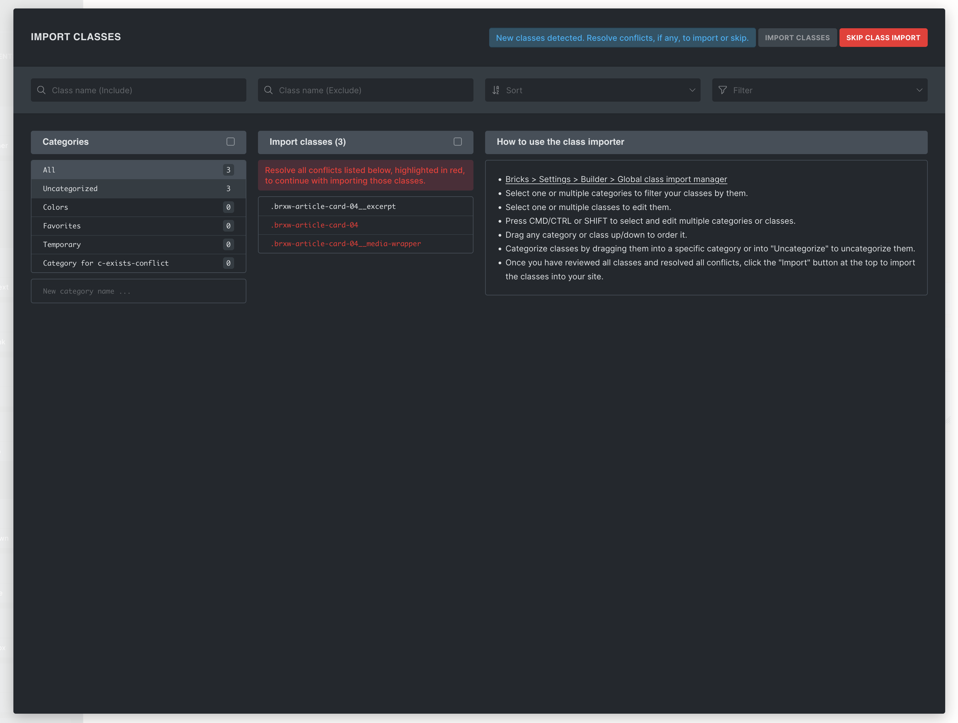 Section titled “When does this show up?”The global class import manager opens whenever global classes are imported into the builder. This includes importing a global classes JSON file, pasting elements, or importing a template. Depending on your settings, it can open for specific situations, such as new classes, conflicting classes, or both.