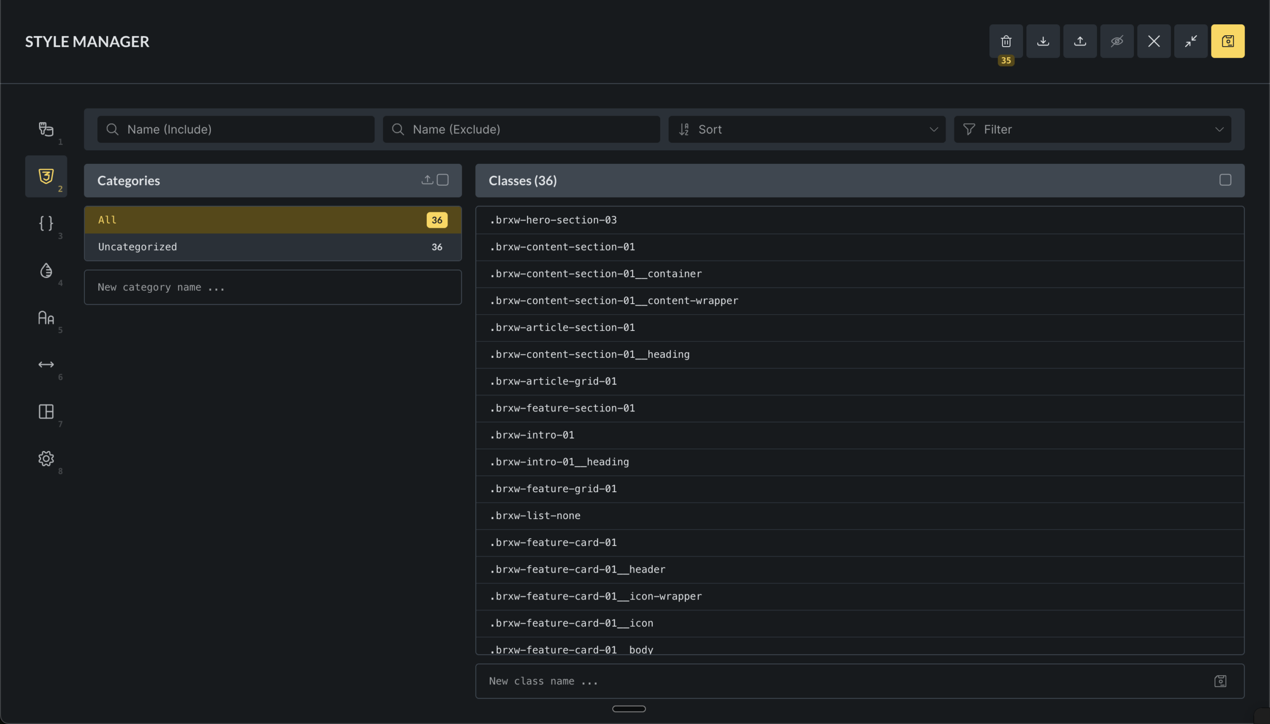 - Manage classes: Create new CSS classes or update existing ones. Delete classes that are no longer needed.
